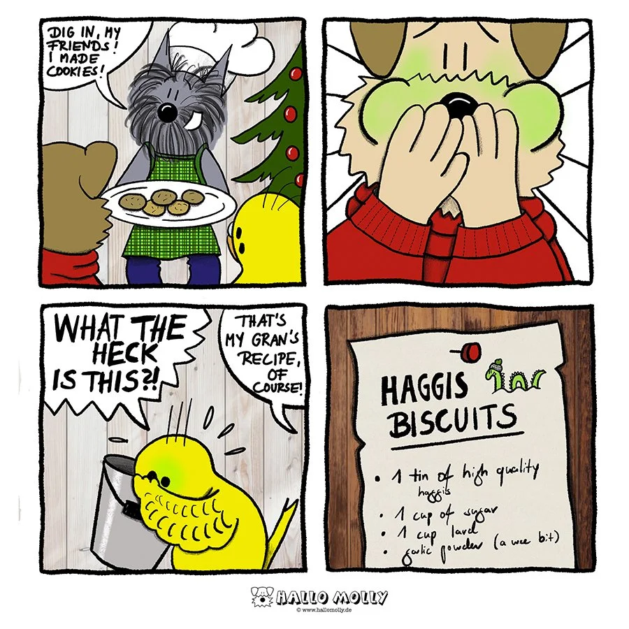 Ever since we got puppy Fergus I’ve started to incorporate Scottish culture into my cartoons, often making jokes about the various forms Fergus incorporates haggis into his cooking, much to the horror of Billabong and Molly as you can see here, merry Haggsmanay and ho ho hurl!