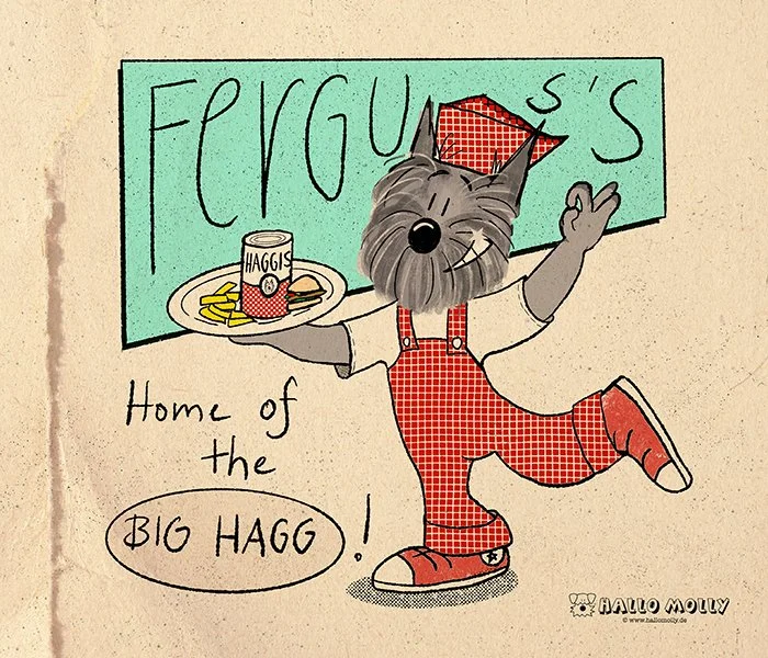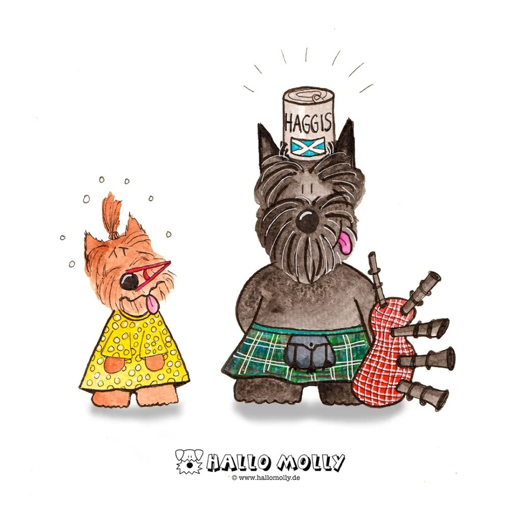 Over the last two years I made a lot of cartoons and illustrations with a Scotland theme, especially after our Scottish Terrier Fergus moved in with us in 2021 (for more about Fergus click here: https://www.hallomolly.de/scottish-terrier-fergus-introduction/.