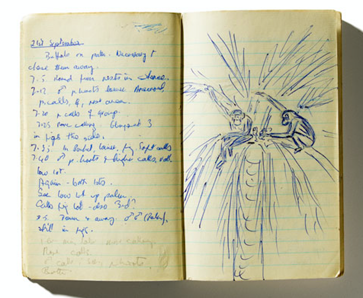 Wir fangen mal ganz unchronologisch mit Jane Goodall an, einfach aus dem Grund, dass sie eine meiner Heldinnen und Vorbilder ist und unglaublich viel für unser Verständnis von Tieren im allgemeinen und Schimpansen im besonderen getan hat und eine der wichtigsten Umwelaktivisten unserer Zeit ist. Kurz: Jane rockt! Jane Goodall führte in ihren Jahren in Afrika ein Feldbuch, wie es viele Feldbiologen heute auch immer noch tun. Ihre Notizbücher sind voller schneller Skizzen und vieler Beobachtungen, auf deren Grundlage sie dann ihre wissenschaftlichen Veröffentlichungen basieren konnte. Ganz unzeremoniell mit Kuli geschrieben, mit Zeitangaben und Skizzen vom Verhalten der Schimpansen.
