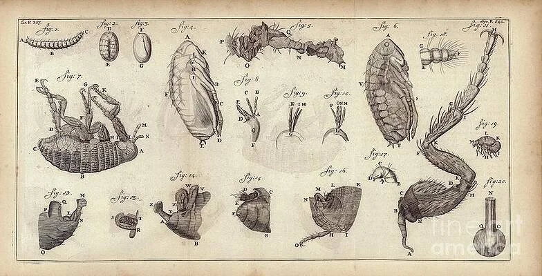 Die mikroskopische Studie eines Flohs. Sehr zu meinem (und dem meines Hundes) durfte ich neulich auch mal einen Floh unterm Mikroskop begutachten, umso mehr bewundere ich Leeuwenhoeks akribische Kleinstarbeit und die genaue Darstellungen der einzelnen Körperteile des Parasitens